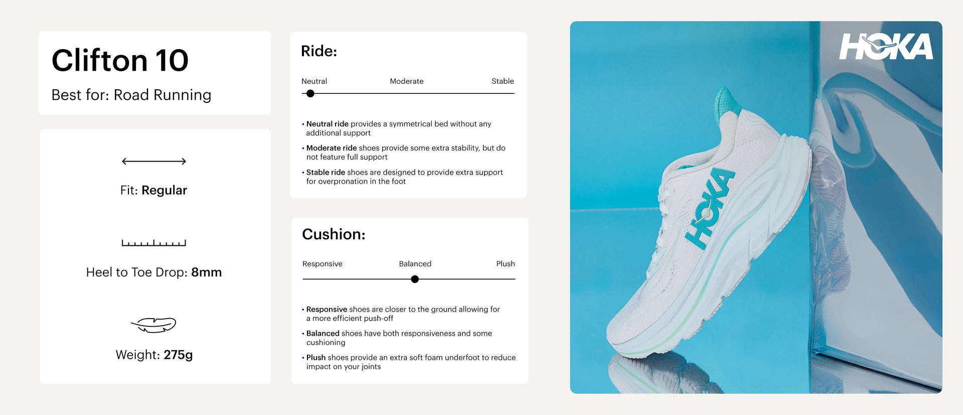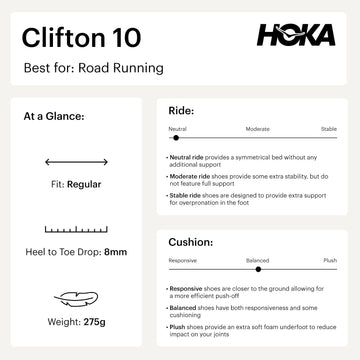 Please note that the Clifton 10 for women has updated its sizing. We recommend going down half a size in UK from your usual HOKA size. For instance, if you typically wear a 5.5UK in Clifton or Bondi, try a 5UK now. If you're new to HOKA, stick with your usual size. Happy running!
