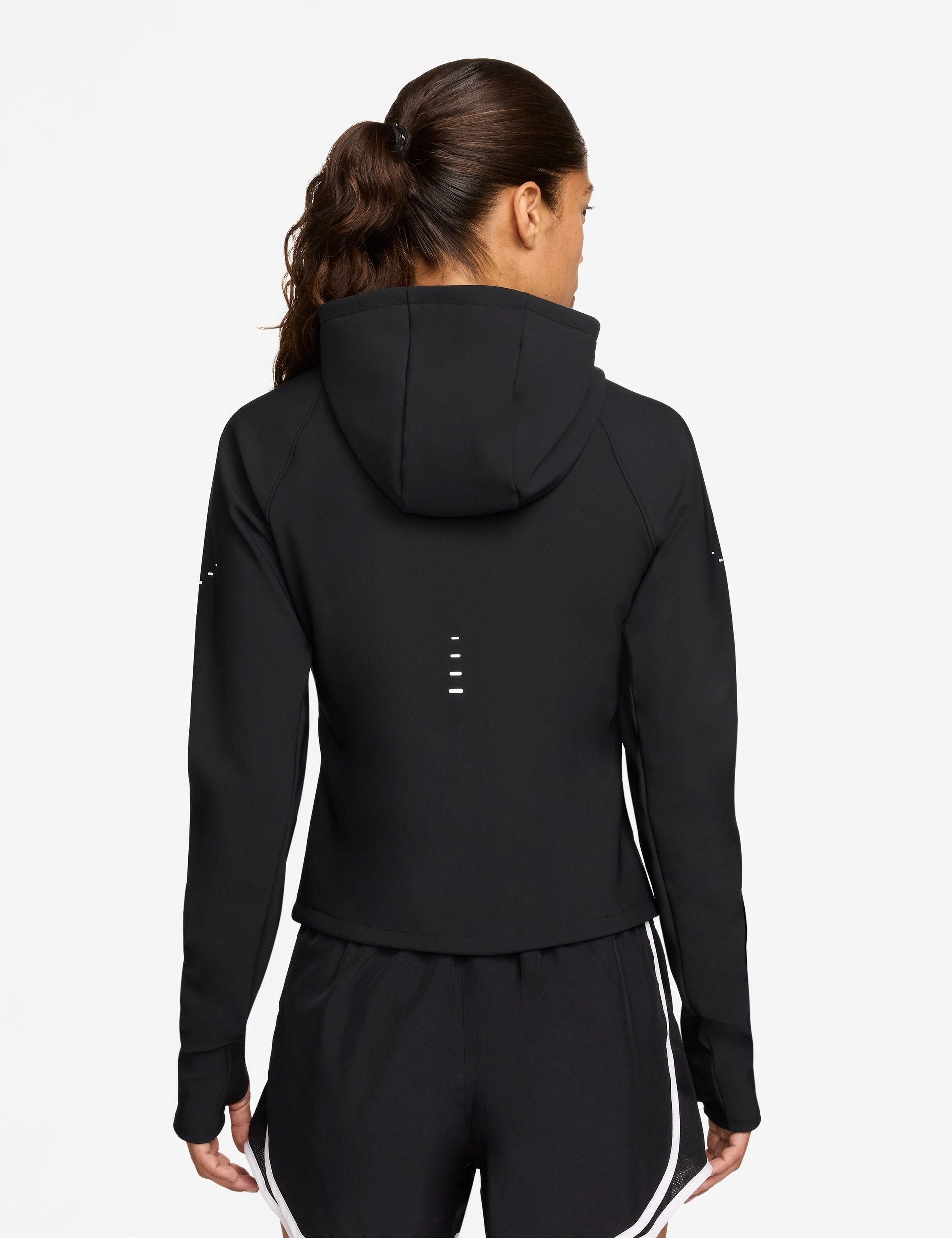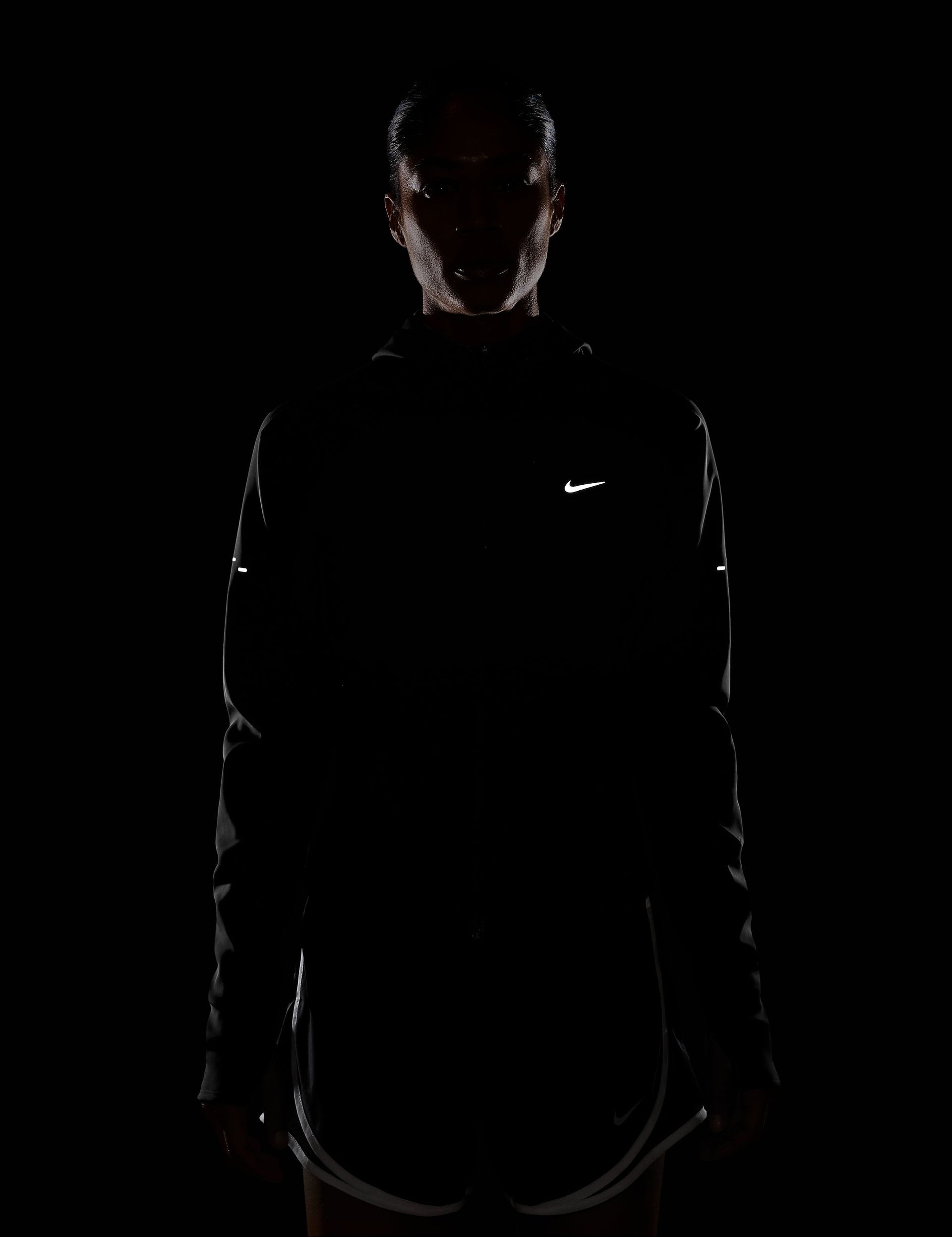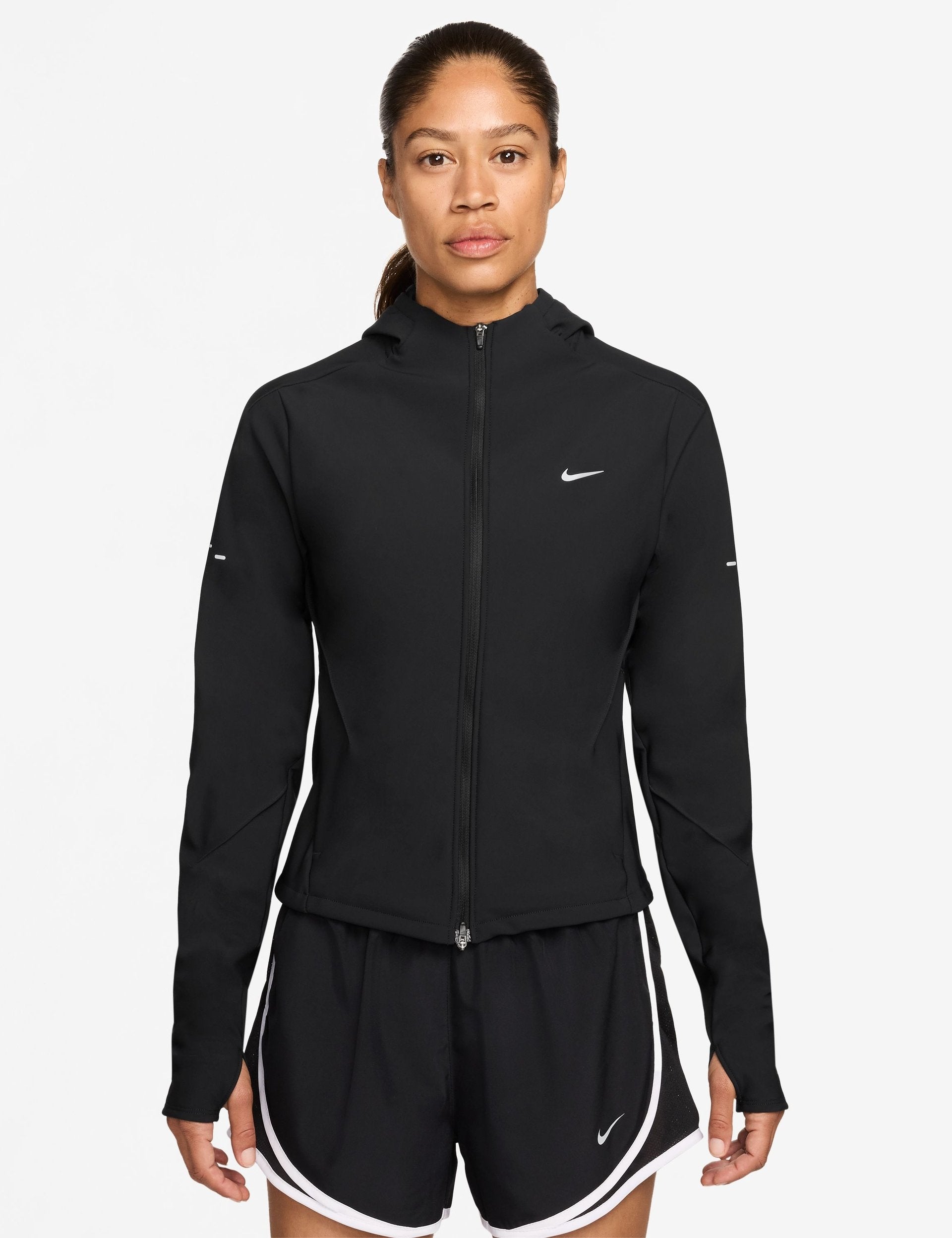 Run anytime, anywhere with the Swift Therma-FIT Fitted Running Jacket, featuring Therma-FIT technology to manage body temperature during cardio sessions in cooler weather. Its slim fit, full zip with hood, and thumbholes provide a tailored, warm feel, while zippered pockets and reflective details add functionality and safety. Perfect for runners who hit the pavement under any conditions.